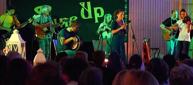 Die sechs Mitglieder der Band, intensiv mit der traditionellen Musik aus Irland und Schottland